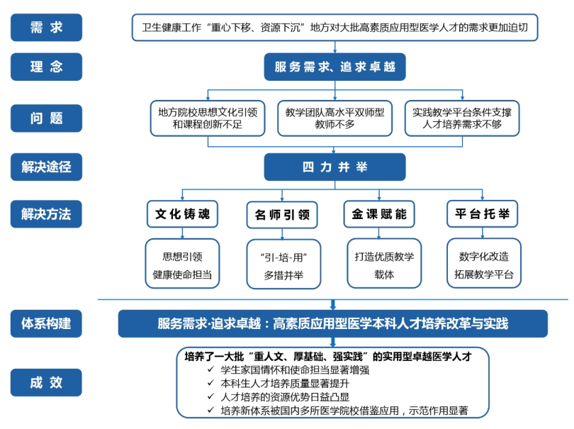 李雪萍教授主持的《服务需求·追求卓越:高素质应用型医学本科人才培养改革与实践》成果,基于国家深化医改对高素质应用型医学人才的新需求,提出“服务需求、追求卓越”的人才培养理念,依托教育部、卫生部2012年第一批3个“卓越医生教育培养计划”试点项目及31项省级教学改革项目,经过十余年研究与实践,创建了“文化铸魂+名师引领+金课赋能+平台托举”四力并举教学模式。通过“杏林育英”思政教育校园文化品牌,引导学生树立正确的价值观;通过“引、培、用”打造了拥有省级黄大年式教师团队、省级教学名师、省级教学团队等高级人才的教师队伍,将高水平双师型师资转化为育人优势;通过名师引领建成了省属医学院校最多的国家级和省级一流课程群;通过持续升级改造国家级及省级实验实践教学示范中心,增建了省级虚拟仿真实验教学中心,将实验平台数字化改造转化为优质教学资源;通过新增三所直属附属医院,将医疗资源转化为实践教学资源,丰富学生沉浸式实践实训体验。据此,创建了“四力并举”高素质应用型医学人才培养体系,通过实践培养了一大批“重人文、厚基础、强实践”的医学人才。这一成果被西部多所高校借鉴应用,示范作用显著。
