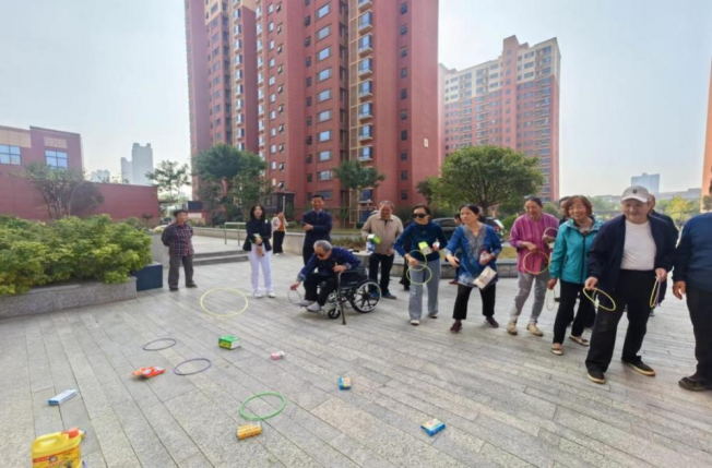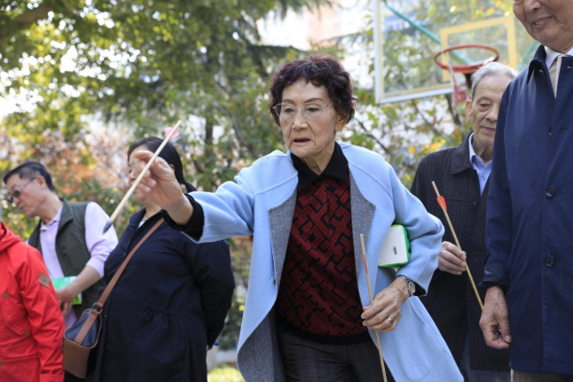 趣味运动会上,投壶、套圈、保龄球等项目妙趣横生,吸引了众多离退休人员参与。投壶项目中,一位头发花白的老教师全神贯注瞄准壶口,轻轻地向前探出身子,手臂微微一扬,箭便稳稳落入壶中,人群中顿时爆发出一阵欢呼声。套圈区域,大家同样兴致勃勃,手拿彩圈认真地比划着,一位老教师小心翼翼地将彩圈抛出,彩圈在空中旋转的同时,期待也随着大家的眼神流转,圈中一刻,老人脸上绽放出孩童般的笑容,掌声、欢笑声随即响彻现场。