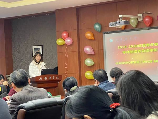 会议共分为两个阶段,第一阶段表彰2019-2020年通过青年教师导师制的导师和青年教师,校领导为我院带教教师钱雯、任宁和宋元源三名副教授颁发荣誉证书,肯定指导教师在青年教师培养过程中所做出的努力,为通过此次考核的教师王一帆、赵凯杨和付蝶颁发荣誉证书及主讲教师资格证书。随后宋元源老师作为优秀导师代表发言,宋老师以其自身教学经验总结出十个相结合与在座教师共勉:“理论与实践相结合、专业课与思政教育相结合、共性与特性相结合、学思与悟践相结合、课上与课下相结合、内容与形式相结合、输出与吸收相结合、主业与副业相结合、隐形教育与显性教育相结合、个人与学院相结合”。宋老师提出此次考核只是迈向新台阶、新征程的起点,寄语青年教师保持优良教风积极投身于伟大的教育工作。