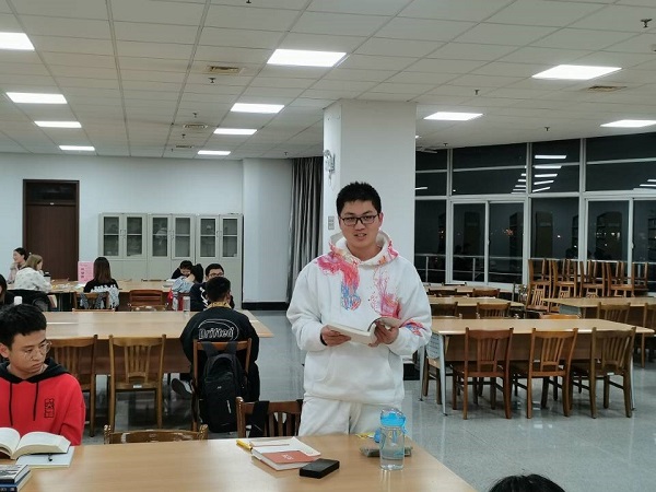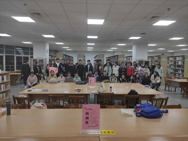 晚上20:30阅读挑战结束。活动主持人对本次活动进行总结发言,并邀请部分挑战者分享读书感悟。在读书分享环节,挑战者踊跃分享自己的阅读体会和心得感想,不仅就阅读的内容互相交流见解,也表达出自己对阅读内容的深层思考。最终四名优秀分享者获得图书馆送出的精美奖品。整个活动圆满结束,共计46位同学挑战成功,校学生会宣传部对本次活动参赛人员及组织者进行了合影留念。