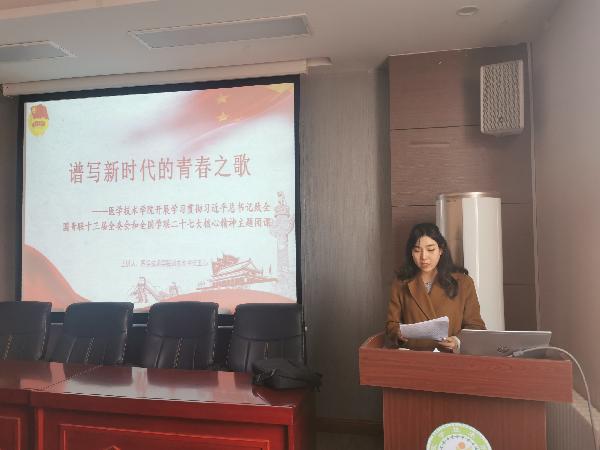 为深入学习领会习近平总书记致全国青联十三届全委会和全国学联二十七大精神,进一步做好学生干部的表率作用,医学技术学院于11月5日在F楼三楼报告厅开展“谱写新时代的青春之歌”微团课。参加本次团课的有医学技术学院学生分会主席团及各部长,团课由医学技术学院团总支书记王心老师主讲。