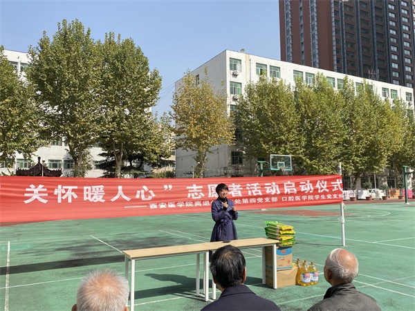 离退休党总支书记刘睿在志愿者活动启动仪式上讲话,向离退休老同志致以节日的慰问,向志愿者服务队的成立表示祝贺,向支持离退休工作的口腔医学院的师生们表示感谢,介绍了省委组织部关于“六联六看六必送”要求及我校的落实情况;他说,离退休老同志年龄大了生活有诸多不便,希望志愿者服务队的同学们在学习和工作之余为离退休教职工提供力所能及的帮助;离退休老同志也有西迁人,是延安精神和西迁精神的践行者,西医精神的缔造者,希望同学们虚心向他们学习,成为传承者,并把老同志的优秀品德发扬光大;也希望离退休老同志要保重身体,凡是自己力所能及的事情自己做,一般情况下不要麻烦学生,不要耽误学生学业。