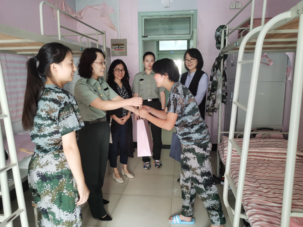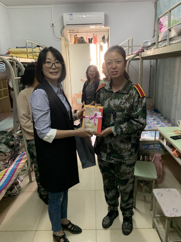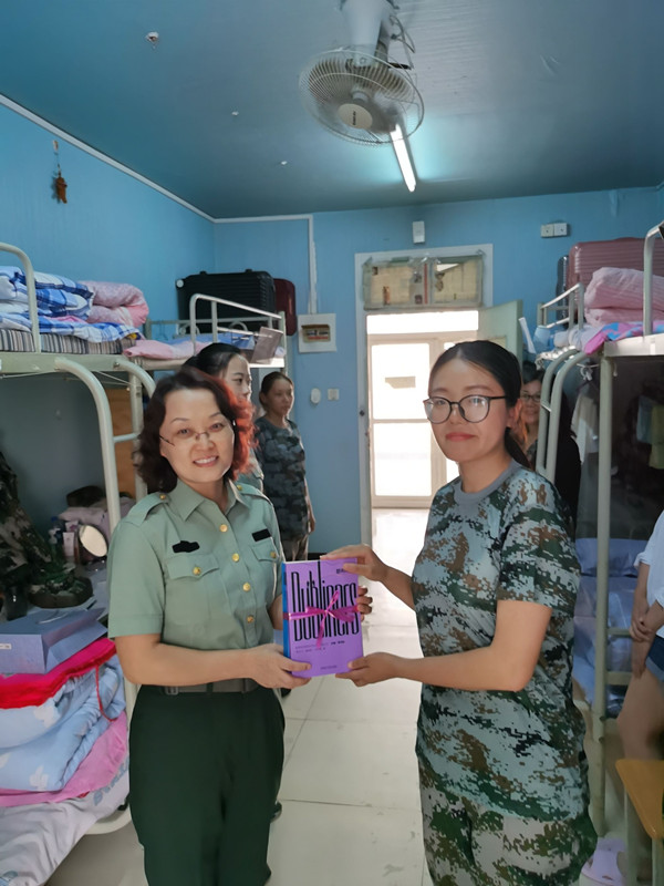 走访慰问过程中,学院领导班子对新生军训以来表现出的优异成绩和不怕吃苦、坚持训练的精神表示充分肯定,对即将到来的中秋佳节和国庆假期对同学们送上祝福,以赠送图书的方式对同学们未来四年的大学生活寄语了美好的希望。他们与2020级新生展开了亲切的交流,询问了同学们的基本信息,耐心解答新生们的问题,帮助解决在目前遇到的一些困难。党总支书记尚瑜强调要把军训期间养成的良好作风保持下去,以5+1S宿舍管理模式要求今后的宿舍卫生,时刻注意个人防护,保持健康的生活习惯,养成健康文明、积极向上的生活习惯和干净舒适的生活环境。院长薛英利向同学们详细分析介绍了近两年学院的就业情况和学科建设情况,勉励同学们要尽快确定职业发展方向,树立理性的就业观念,珍惜时间,提前规划。薛婷副院长向新生们介绍本次捐赠图书均属高等学校英语专业经典必读丛书,体裁涵盖小说、诗歌、散文、戏剧,按难易程度分为4个级别,图书对应蓝、绿、橙、紫四种封面色。并指出书香九月•喜迎新生活动”旨在以图书阅读活动为载体,引领新生开启丰富多彩的大学生活;激励英语专业新生将经典阅读变成一种学习常态、切实提高自身的英语能力与人文素养。
