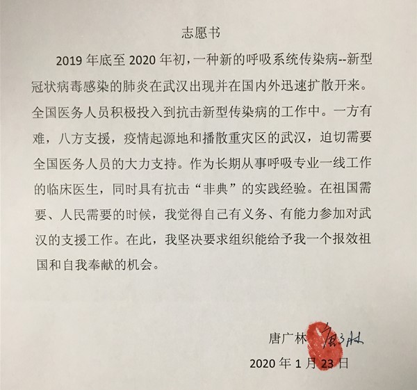 2020年1月以来,新冠肺炎疫情从武汉向全国蔓延,当医院领导提出需要派医护人员支援武汉时,唐广林主任多年呼吸与危重症医学临床专业经验的这份使命感和无数急待救治的患者督促着他,2003年陕西省抗击“非典”先进个人的荣誉激励着他,数千名已经到达武汉天河机场的“逆行者”在召唤着他,他毫不犹豫地第一时间向医院提出了书面申请。