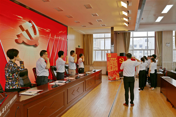 在党政办主任田野的领誓下,医院12名新党员佩戴党徽,面对鲜红的党旗,右手举拳郑重宣誓:“我志愿加入中国共产党,拥护党的纲领,遵守党的章程……永不叛党!”
