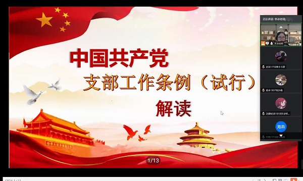 第三次党课培训由学生第二党支部书记李冰老师讲授,党课内容是《中国共产党支部工作条例(试行)》解读。李老师指出,《条例》对党支部工作作出了全面规范,是新时代党支部建设应当遵循的基本规章。一定要深入学习《条例》内容,全面贯彻落实《条例》新要求新规定新部署,不断提升党组织的创造力、凝聚力和战斗力。