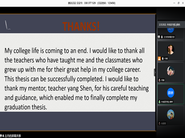为保证2020届毕业生不受疫情影响,如期通过答辩并顺利毕业,外国语学院在学院领导的统筹部署下,经前期悉心规划准备,于2020年5月20日-5月21日顺利开展了各分方向毕业论文线上答辩工作。