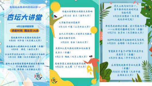 教发评中心长期关注教育部全国高校网络培训中心,并签约优质网络培训课程,疫情期间,为更好的服务于我校“停课不停学”政策,教发评中心对全校教师开放“教师在线学习”平台服务,并联合教育部全国高校网络培训中心通过我校“在线学习平台”,每周一至周四下午14:00 向全校教师开放“杏坛大讲堂”直播讲座,同时开设“战‘疫’系列公开课”与网络培训同步集中课程,服务教师。