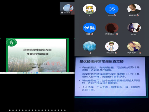 受新冠肺炎疫情影响,2020届毕业生就业工作面临更多挑战,为了使同学们充分了解当前就业创业政策、把握机遇,4月29日上午,药学院举办“云端”就业创业指导交流会。药学院党总支副书记王黎、校企合作办全体老师、毕业班辅导员和药学院高年级学生参加了本次会议,会议由学生科科长杨欣雨主持。