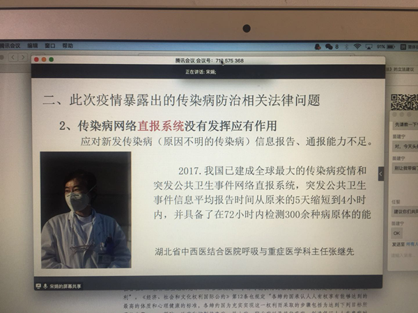 整个讲授过程紧跟疫情热点,分析深入浅出,很快引起了共鸣,讲授结束之后,与会教师们围绕法定传染病要不要免费诊治、网络直报系统如何规范、如何保护一线医生等话题展开了热烈的讨论。聊天窗口表达观点和语音直播自由切换,“云端”研讨气氛活跃又特别。