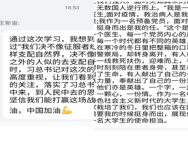 倪旭同学说:“在疫情大考大战中锤炼党性。我始终把加强政治理论学习放在首位,充分运用好学习强国app、人民日报等党媒载体。在这场战役中,我看到了广大的党员干部争做走在抗“疫”前线的奋进者、开拓者、奉献者,为夺取疫情防控胜利贡献自己的力量!在今后工作中,我将继续严格要求自己,以初心前行,以使命担当。”