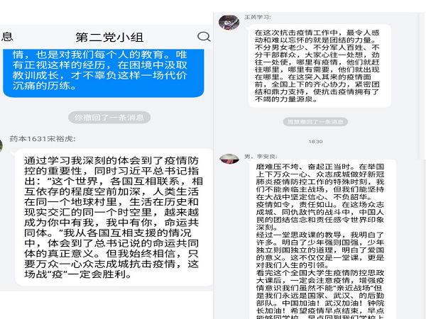 疫情防控工作开展以来,药学院党总支认真贯彻落实学校各项工作部署,把学生党支部落实组织生活制度作为凝心聚力、激发斗志的重要抓手。3月27日晚,学生一支部以三个党小组为依托,分别组织集中线上学习和交流,共同回看“疫情防控思政大课”、学习习近平总书记关于做好新型冠状病毒感染的肺炎疫情防控工作的重要指示和党中央的决策部署、学习习近平总书记给在首钢医院实习的西藏大学医学院学生的回信、学习“三秦楷模”施秉银、付凡平同志和赵梦桃小组的先进事迹以及分享抗疫一线的感人故事等等,筑牢思想防线,坚持疫情防控监督与理论知识学习两手抓、同推进。 钱文强同学说:“面对这次疫情大考,党和国家采取了坚决有力的防控措施,展现出了出色的领导能力,为世界疫情争取了足够的时间,充分践行人类命运共同体,我们青少年应该秉行‘一花独放不是春,百花齐放春满国’。不忘初心,作为一名医学生在治病救人的道路上努力充实自己,将国家和人民的利益放在第一位!”