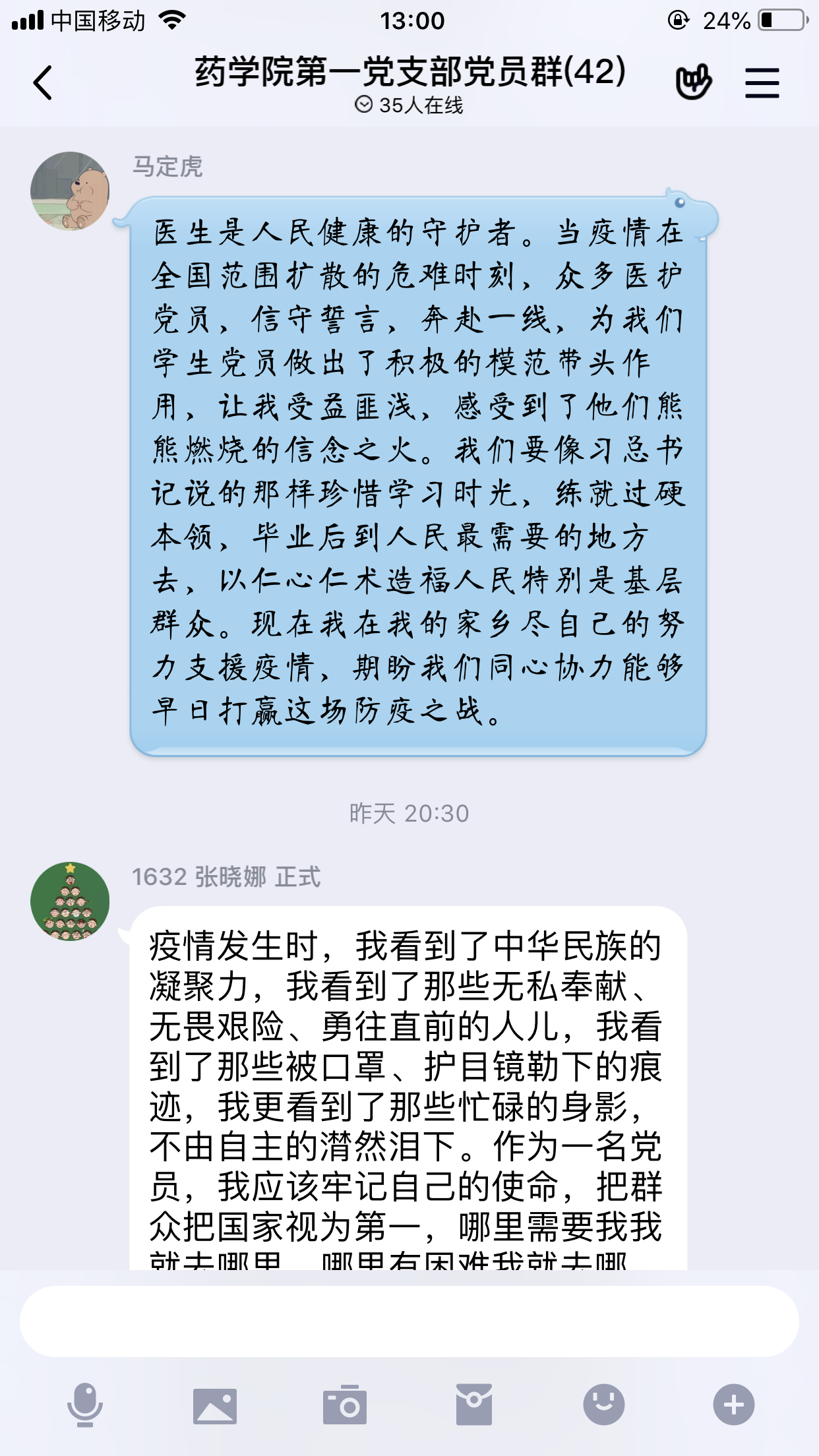 正值全国人民齐心协力抗击疫情的关键时期,看到习近平总书记写给医学实习生的回信,药学院全体学工教师、学生党员、团员青年通过微信、QQ、易班等在线平台广泛开展学习,特别是毕业班辅导员、实习生更加深切的表达了心中的感想;更加深刻的理解到“医生是人民健康的守护者”这一职业涵义,更加深入的思考什么是“不忘初心,牢记使命”。 党总支副书记王黎感悟: 一场疫情,医与患的理解多了;一段距离,师与生的沟通多了;这段日子,对所有人都是一次锻炼和考验,作为医学生的培养者责任更重了,作为来自四面八方的学子求学目标更明确了。一位位不畏艰险、义无反顾走上“前线”的医护人员,还有身边那些立足岗位、任劳任怨做好服务的基层人员,都是这个春天最可敬的人,都是值得我们医药同学学习的榜样。习近平总书记的回信,是对西藏大学同学们工作的鼓舞,也是对我们每个同学的激励与期望。“珍惜学习时光,练就过硬本领,毕业后到人民最需要的地方去,以仁心仁术造福人民特别是基层群众”,我们努力做到!