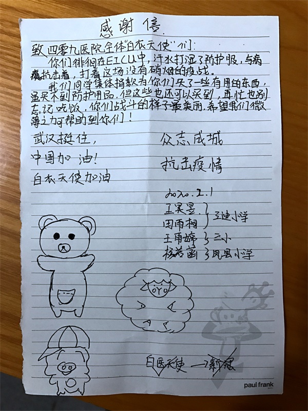 打开袋子,里面塞满了水果、面包和奶制品。一起放在里面的,还有一封信,上面写着:“白衣天使们,你们徘徊在ICU中,汗水打湿了防护服,与病魔抗击着,打着这场没有硝烟的疫战。虽买不到防护用品,我们同学集体捐款为你们买了一些有用的东西,再忙也别忘记吃饭,你们战斗的样子最美丽,希望我们的微薄之力可以帮助到你们。武汉挺住,中国加油,白衣天使加油!”落款为来自三所小学的四名学生,看到这一幕,医务人员十分感动。
