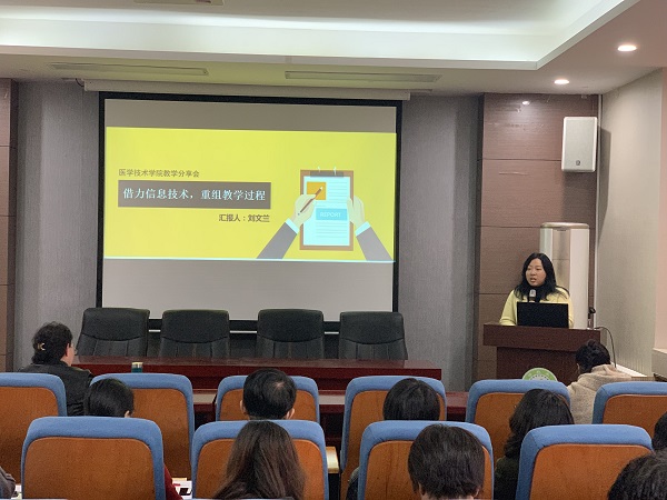 首先,眼视光教研室刘文兰以《借力信息技术,重组教学过程》为题,分享了她近几年在信息化教学过程中的经验及思考。重点的分享了她在教学方面的个人感悟及她的教改课题《闭环式O2O混合教学模式》的具体做法。内容丰富,贴合实际教学,引起了参会老师们的共鸣。