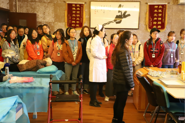 在医院护士长的带领下,师生共同参观了医院非常具有特色的医疗、养老、康复、保健和照护为一体医养结合模式,观看了以杨瑞辉护士奉献医学事业为题材的《瑞辉映夕阳》主题教育记录片,随后师生对基层医疗卫生工作中常见的事实及伦理学问题进行了讨论。