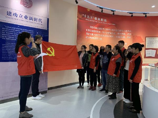 参观最后,在支部书记唐俐玲的带领下,全体党员面对党旗、高举右手重温了入党誓词。