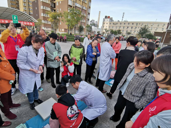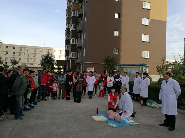 接下来,张鹏副教授对心肺复苏的适用指征及操作流程向居民进行宣讲,并按步骤进行演示。演示完毕,居民们在学院教师的指导下进行实际操作和体验,居民们纷纷响应、踊跃参与,现场气氛热烈。