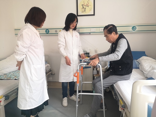 党员老师帮助老人做康复训练