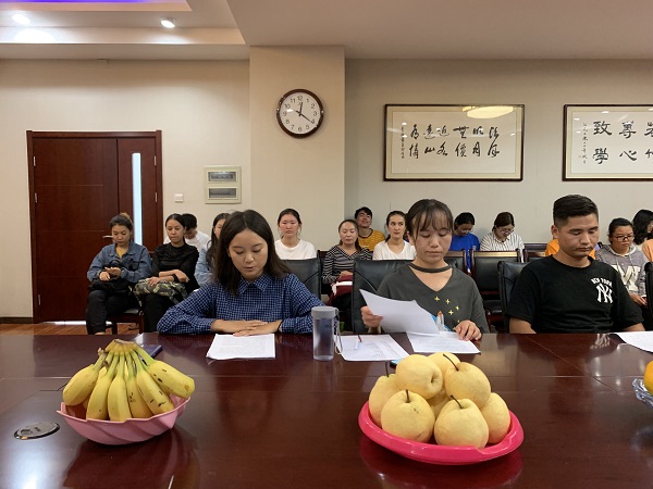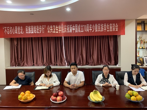 为深入贯彻落实党的十九大和习近平总书记在“不忘初心、牢记使命”主题教育工作会议上的重要讲话精神,为了解关心少数民族学生的学习和生活情况,加强与少数民族学生的情感交流、增进友谊,促进团结,教育学生爱国爱党爱社会主义,值此中华人民共和国成立70周年之际,9月29日中午,公共卫生学院在学院会议室举办“不忘初心跟党走,民族团结进步行”庆祝新中国成立70周年少数民族学生座谈会。我校学工部少数民族学生管理科于坚老师、公共卫生学院党总支副书记张光伟、学生副科长杨茜、少数民族工作专干史秦以及辅导员出席座谈会,30名少数民族学生代表参加了此次座谈会。会议由少数民族工作专干史秦主持。 会议伊始,学生科副科长杨茜详细了解了2019级少数民族新生的入学适应情况。少数民族新生逐一进行了自我介绍,包括个人基本情况、入学适应情况、学业情况、资困助学情况以及学习生活中遇到的问题。杨老师指出,学校和学院对少数民族同学的培养发展高度重视,希望同学们不断坚定理想信念、厚植爱国主义情怀、加强品德修养,增强自信心,自强不息,加强体育锻炼,更好地融入大学的整体环境中。