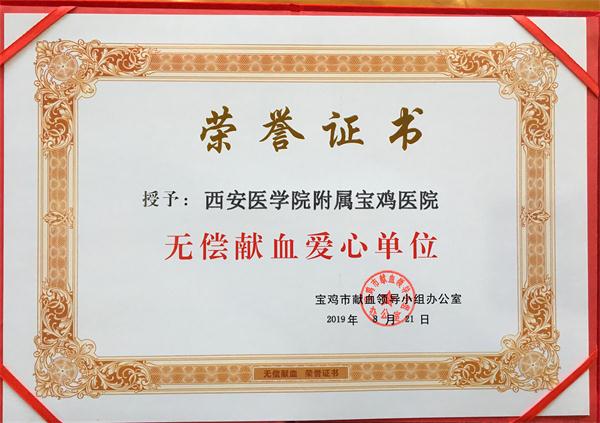 无偿献血爱心单位荣誉证书