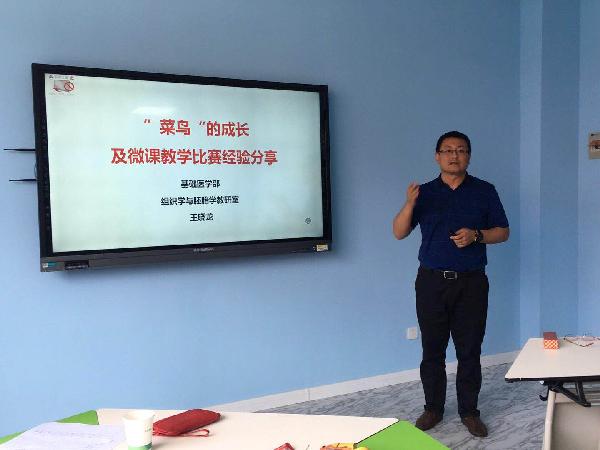 基础医学部王晓龙博士做了“‘菜鸟’的成长及微课教学比赛经验分享”的专题报告,从团队协作、内容选择、内容编排、细节把握等方面分享了自己参加教学竞赛的经验。