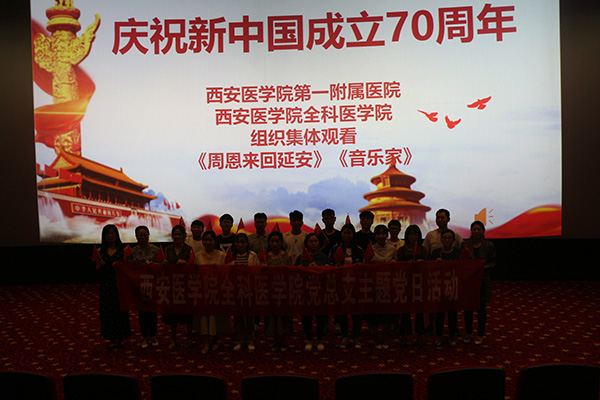 2019年是新中国成立70周年,为激励和引导青年师生大力弘扬爱国主义精神,深刻领悟“坚韧不拔、志存高远、求真务实、爱国奉献”的星海精神,5月30日和6月3日,全科医学院党总支分别组织教职工和学生党员共45人观看了爱国影片《音乐家》,观影开始前,全体师生还一起合唱了《我和我的祖国》。