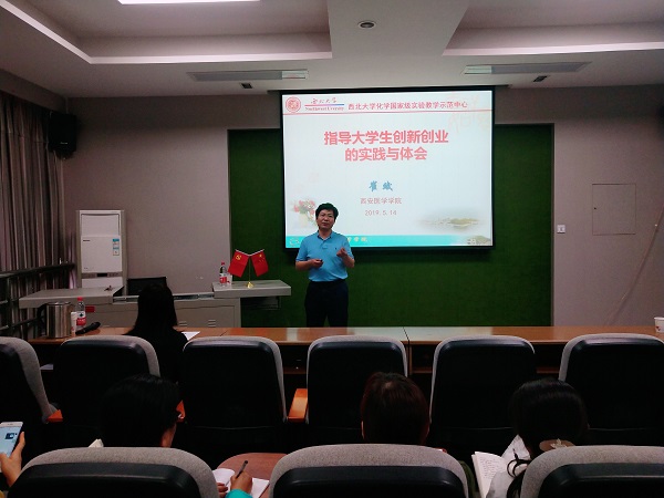 2019年5月13日中午,受药学院邀请,西北大学化学国家级实验教学示范中心主任崔斌教授在立德楼E303学术报告厅作了创新创业专题报告会。药学院秦蓓院长、吕忠田副书记、冯永辉副书记、杨欣雨科长及药学院部分师生出席了会议。 首先,秦蓓院长对崔斌教授来到我校对药学院师生进行创新创业理念培训和指导表示诚挚的欢迎。她在致辞中指出,国家十分重视大学生创新创业活动,提出了青年师生共同创新创业的“青创+”新理念,对第八届陕西省大学生化学实验邀请赛药学院初赛获奖学生给予肯定及鼓励。