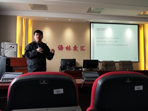 首先,唐宇老师对英语专业四级考试的特点进行了详细地分析,围绕提升词汇量、听力、阅读、语法等方面展开细致讲解。同时结合英语专业四级相关真题,重点分享关于听力、阅读等方面的考试技巧,为同学们提供了一系列考试复习的策略。讲座中,唐老师给同学们提出记忆单词和练习听力的高效方法,打破了同学们学习英语的常规思路模式,整场讲座内容充实、贴近实际。唐老师分享自身学习英语的经历,鼓舞同学们要脚踏实地的巩固基础知识,刻苦锻炼基本技能,幽默诙谐的语言表达引来一阵阵雷鸣般的掌声。
