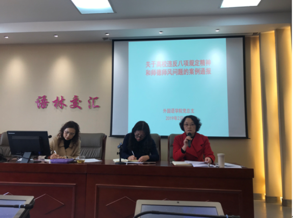 为进一步巩固中央八项规定精神贯彻落实成果,净化党风政风,营造外国语学院良好政治生态,2月27日下午外国语学院党总支组织召开全院教职工大会,传达省纪委驻省教育厅纪检组关于高校违反中央八项规定精神和师德师风问题的典型案例的通报,并就进一步开展违规收送礼金专项整治工作作出安排。