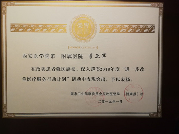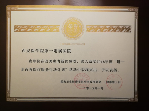 2018年,第一附属医院紧紧围绕国家卫计委“进一步改善医疗服务行动计划”工作要求,开拓创新,从人民群众看病就医过程中最关切的问题着手,持续改善就医环境、提升医疗服务水平,构建起优质高效的医疗服务体系。其中,西安急救中心城西分中心落户一附院,胸痛中心通过国家标准版认证,组建ECMO团队,加大发挥多学科诊疗优势,开通“绿色生命通道”,缩短危重患者抢救时间窗,使抢救成功率大幅度提升;设立门诊 “一站式”服务中心,整合、充实各项便民服务措施,点滴细节处处为患者着想;开展健康饮食宣传,引导患者建立营养膳食理念,主动利用营养风险筛查工具对重点住院病人进行营养风险筛查、开具营养处方;推行“厕所革命”,创建“无烟医院”,努力营造洁净的就医环境。