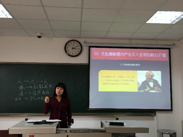 西北大学程馨莹副教授示范教学的主题为《无私奉献的共产主义人生观》,她在教学科研方面都取得了骄人的成绩,获得过四项省级科研奖励和“陕西省高校思政课教学能手”称号。程老师用“怎样的人生才是幸福的?人生的意义是什么?我应该朝什么样的目标奋斗”三个问题导入新课。讲授中她以女性特有的魅力娓娓道来,先后从无私奉献是共产主义人生观的核心价值、无私奉献是社会主义建设的必要条件、无私奉献是实现人生价值的必由途径三个层面阐释了古今中外历史名人和普通百姓为历史发展做出的贡献,凸显出他们通过牺牲“小我”实现国家富强,社会发展的终极价值。程老师的教法自然,教学逻辑清晰,教学内容丰富,引人入胜。