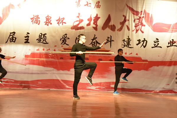 党委宣传部记者站集体合唱歌曲《国家》,以嘹亮的歌声动听的旋律唱出了当代大学生满腔爱党爱国的真挚情怀。由共青团学生社团联合会表演的古典舞《浪人琵琶》,洋溢着中华传统文化的气息。爱国奋斗,建功立业,需要强健的体魄、坚强的意志来实现,伴随着中华文明走过几千年风雨历程的中华武术是中华民族的骄傲,共青团学生社团联合会武术表演《止戈》淋漓尽致地展现国粹文化、功夫魅力!特邀西北大学播音专业学生代表表演的校园劲舞《创造101》,掀起全场阵阵热烈掌声。