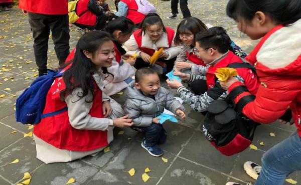 2018年11月22日是西方的感恩节,周日阳光正好,小雁塔景区也有很多游玩的小朋友。志愿者们拿出提前准备好的彩纸教小朋友们折花,对父母表示感恩之情。