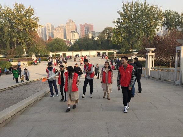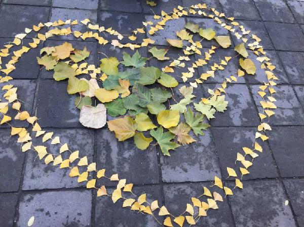 在小雁塔景区有很多的落叶,志愿者们组成小组纷纷捡起地上的树叶,有的组拼画出一个完整的中国地图,有的组拼画出志愿服务的标志,还有的组拼画出笑脸。在小组配合的活动中,把对祖国的热爱落到实处,把团队精神不断提高。