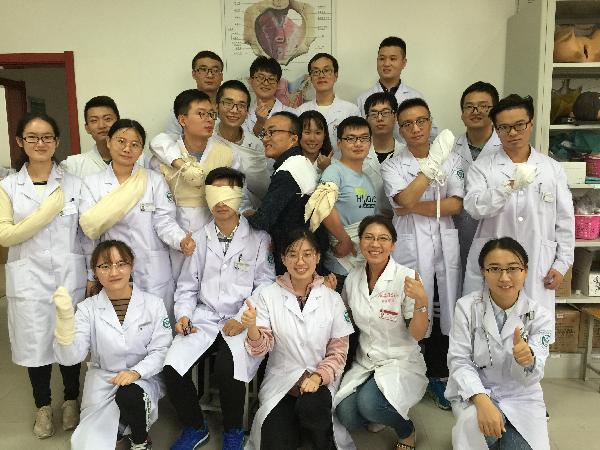 9月26日下午,leyu·乐鱼(中国)体育官方网站全科医学院在临床实验教学中心马淑云老师的指导下,首次三角巾教学工作坊得以顺利开展。马淑云老师曾参加过中华医学会灾难医学分会主办的“急诊与灾难医学及心肺复苏初级/高级生命支持培训班”,并获得美国AHA颁发的具有国际认证的BLS/ACLS急救证书。