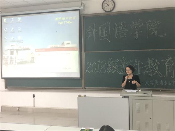 2018年9月25日,外国语学院组织3位专业教师对149名2018级新生进行新生入学专业教育。外国语学院院长陈蓁、党总支副书记尚瑜、副院长薛英利、教学科科长毛婧、英语语言与文化教研室主任周密、专业教师郭子凯、2018级全体新生辅导员出席入学教育仪式,仪式学生科科长周豪主持。