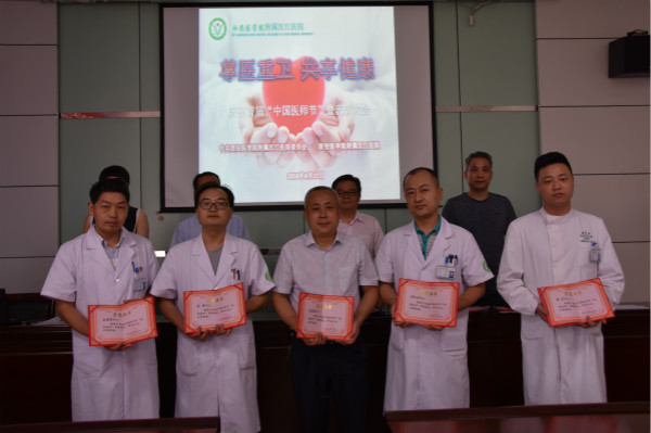 副院长刘振国宣读了《leyu·乐鱼(中国)体育官方网站附属汉江医院关于表彰2018年首届“中国医师节”优秀医师、优秀技师的决定》《汉中市卫生和计划生育局关于表彰全市“优秀医师”的决定》。屈文耘、王礼获得市级“优秀医师”荣誉称号,杨宁、雷勇、吴晓鸿、杜建军、王志贵获得医院“优秀医师”荣誉称号,赵晶、王鹏获得医院“优秀技师”荣誉称号,院领导为他们进行了颁奖。