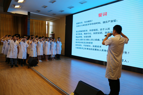 大会在以“尊医重卫,医路有你”为主题的庆祝医师节专题宣传片中拉开帷幕。附属宝鸡医院青、中、老三代医者就从医初衷、未来展望及对年轻医生的嘱托等方面娓娓道来,为我们呈现了一幅幅生动的画面:爱岗敬业、甘于奉献、视患者利益高于一切的西医附属宝鸡医院人奋斗在治病救人的第一线,为医疗卫生事业、为医院的发展壮大默默奉献着他们的青春和热血。随后,医务科王福顺科长带领新入职医生庄严宣誓,所有参会人员一起重温医生誓言,体会自己所从事这份职业的神圣感、责任感、使命感。
