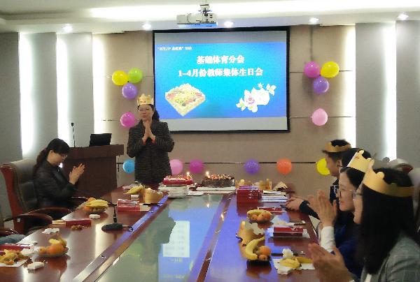 2018年4月25日下午,伴随着“生日快乐”的歌声,基础体育部分工会“职工之家”本年度第一次“集体生日会”如期而至,为1-4月份出生的老师“过生日·送祝福”,让老师们感受到学校和分会大家庭的温暖和幸福。