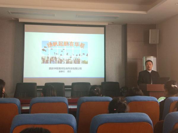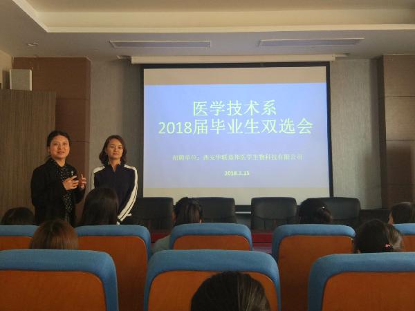 2018年3月15日下午医学技术系在报告厅举行了西安华联嘉邦医学生物科技有限公司2018届检验专业毕业生双选会,医学技术系主任孙静、党总支副书记耿潇潇、吕宝参加了双选会。西安华联嘉邦医学生物科技有限公司董事长总经理俞方进行了宣讲。