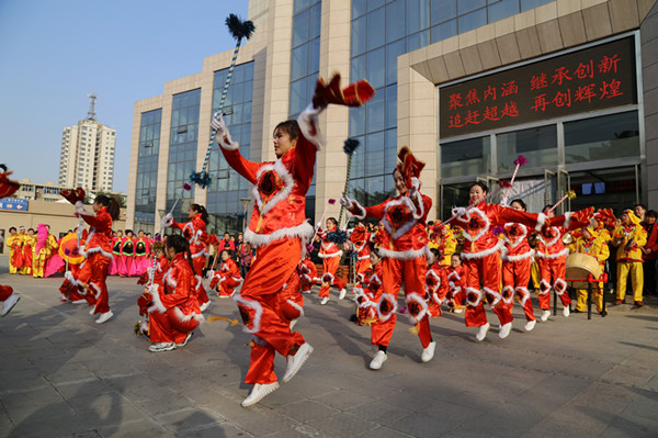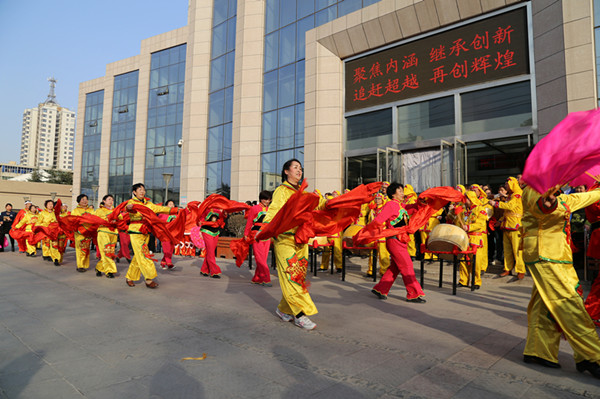 一时间,广场上锣鼓震天,彩绸飘动,热闹的表演让现场观众大饱眼福。彩绸、扇子、花伞等离退休老同志组成的特色的秧歌队踩着欢快的鼓点,挥舞着飘带,脸上洋溢着喜庆的笑容。在铿锵的鼓点声中,威武的雄狮腾挪跳跃间展示着雄风;锣鼓队鼓声喧天,气势如虹;腰鼓队鼓音明快,步伐轻盈;不论是精彩的秧歌表演,还是热烈奔放、豪情直冲云霄的锣鼓,都让人们在精彩的表演里放飞了快乐的心情,放飞了新年的希望。大头娃娃穿梭于整个现场,为观众分发小礼物,并不时与大家合影留念,令现场呈现出一派热烈、欢腾、喜庆的景象。