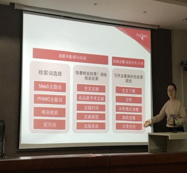 接着唐思信息科技公司的丁艳君经理又为读者带来了试用资源(ProQuest)健康医学大全数据库的精彩培训,内容涵盖ProQuest的资源优势、资源使用,同时还分享了论文选题、开题、撰写综述、跟踪进展、潜在合作方面的相关经验。