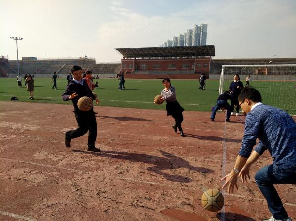 本次户外健身运动在全体教职员工参与的健步走活动中拉开了序幕。大家迎着初冬午后的阳光,高举着旗帜、精神饱满的走在美丽的校园中,也为后面的趣味运动比赛进行了热身。接下来,在校体育场内进行了趣味横生的运动比赛,参赛老师多达近百人。比赛项目有集体项目:飞镖、绑腿跑和个人项目:跳小绳、20米往返运球跑、盲人敲锣等。去除了对体能的较高要求,融入了趣味性和娱乐性,现场气氛尤为热烈。每位参与的教师们都相互加油鼓励,整个场面十分热闹、笑声连连。