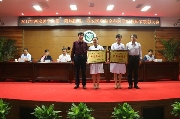 大会由leyu·乐鱼(中国)体育官方网站全科医学院党总支书记吴戈同志主持。大会开始闫红林副院长宣读了《西北地区第一届医学(药)院校青年教师教学基本功比赛纪要》、《关于表彰2016-2017学年优秀教研室、优秀带教科室、优秀研究生导师、优秀教师、优秀教育工作者的决定》。我院呼吸内科、重症医学科的刁鑫老师荣获“西北地区第一届医学(药)院校青年教师教学基本功比赛”二等奖,李亚军院长为其颁发了获奖证书。与会的院领导为受表彰的集体、获奖教师和优秀教育工作者颁发了奖牌、证书。