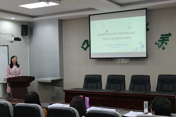 (口腔医学系)4月19日口腔医学系在至善楼二层阶梯教室举行了国家自然科学基金项目、陕西省教育厅科研基金项目开题报告会。口腔医学系学术委员会成员担任本次开题报告会评委,口腔医学系全体教师参加了会议。 本次开题报告会共有4项课题参加。首先,唐成芳、周芳、李雪、曾辉四位课题负责人就课题的立体依据、研究目的、研究内容、年度计划、经费预算、预期结果等做了汇报,随后评委组成员本着严谨、科学的态度,针对项目的重难点和创新点以及研究过程中可能出现的困难与课题负责人进行了深入的交流和探讨,并提出了许多有关键性和建设性的意见和建议。课题负责人还与口腔医学系其余老师进行了互动交流,最后口腔医学系主任朱勇对本次报告会进行了总结,他表示本次报告会对口腔医学系教师整体科研素质和科研能力的提升起到推动作用。口腔医学系与会教师一致认为本次开题报告会提供了一个良好的学术交流平台,对今后申报高级别的科研项目有很大的启示作用。