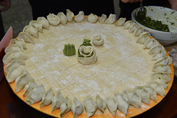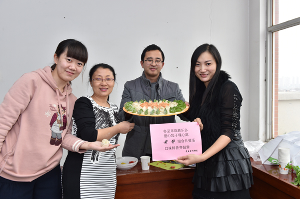 两人一组,自由组合,报名参赛的16组选手摩拳擦掌,跃跃欲试,不及开始号令,已迫不及待的操持起来。和面、擀皮、调馅、包捏,忙而不乱,喧嚣赞叹。可不要小瞧他们,看得出各个都是行家里手。白皮的、绿皮的、红皮的、双色的,长的、方的、圆的、花的,各种式样,美轮美奂;冬至大餐就在眼前,叫人垂涎欲滴。16组能工巧匠,分工井然,情感高涨,收获的喜悦和成功的满足洋溢脸庞。