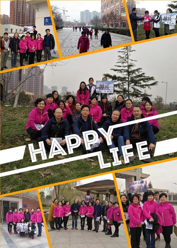 12月7日中午一点,分会全体教职工与党旗、系旗、条幅合影,一声口令,同志们由 “瑞金”出发。之前,系分会精心策划,周密安排。“瑞金”、“血战湘江”、“遵义会议”、“四渡赤水”、“巧渡金沙江”、“飞夺泸定桥”、“强渡大渡河”、“爬雪山”、“懋功会师”、“过草地”、“激战腊子口”、“大会师”、“延安会师”共十三个站点均根据“长征路”的特点与校园地形设定。在小路曲折的草坡上“爬雪山”,教学区与生活区的学府大道就是“赤水河”,教学楼周边需要兜转几圈才能找到的“巧渡金沙江”,离起点不远的校体育场东门广场,像“凯旋门”一样是长征胜利象征的“延安会师”处……。行进中同志们兴致浓浓,八十五年前抗日救亡的崇高使命,先烈们历尽艰险,勇往直前,无畏牺牲的精神荡气回肠;健步走不只是健身,也是对大家精神的砥砺。
