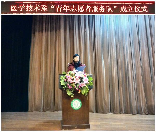 为进一步弘扬“奉献、友爱、互助、进步”的志愿者精神,促进我系青年志愿服务组织建设,加强志愿服务组织规范化管理,增强青年志愿者服务行动的广泛性,2015年12月14日下午,在未央校区学术报告厅隆重举行了“医学技术系青年志愿者服务队”成立仪式。学工部副部长校团委书记王燕、系党总支副书记耿潇潇、系党政办主任任熙玲、系学生科长学生第二党支部书记吕宝、系团总支书记学生第一党支部书记魏慧、系全体专职辅导员老师出席了本次活动。魏慧老师主持仪式。