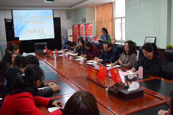 (医学技术系)为增进师生之间的交流和沟通,提高教学效果,推动教学及管理工作的建设,医学技术系落实学校期中教学检查工作,于2016年11月22日下午14:30在立言楼医学技术系会议室召开2016-2017学年第一学期期中教学检查学生座谈会。参加此次会议的有院长杨帆、教务处副处长娄鸣、校团委书记王燕、医学技术系副主任孙静、副书记耿潇潇、医学技术系学生科长吕宝、教学科副科长韩文霞及各班学生代表。会议由医学技术系副主任孙静主持。